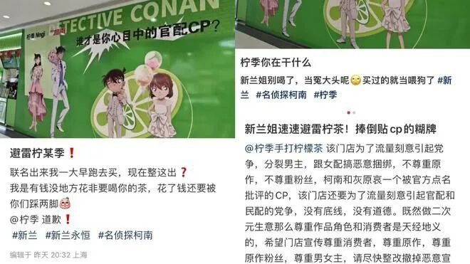 新茶飲品牌檸季手(shǒu)打(dǎ)檸檬茶營(yíng)銷又翻車。多日來,有網(wǎng)友發帖投訴,檸季與日(rì)本知名IP《名偵探柯南(nán)》官宣聯(lián)名,但有門店掛出寫有“誰(shuí)才是你心目中(zhōng)的官配CP”的海報,海報上印有柯南(工藤新一)和灰(huī)原哀,工藤新一和毛利蘭兩組人物。有網(wǎng)友表示,柯南及灰原(yuán)哀在原作中並非戀人關係(CP),並且指責品牌方不尊重原作。