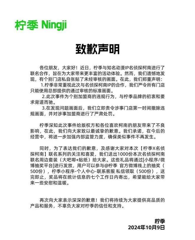 檸季表示,深知此次事件(jiàn)給版權方和各位喜歡柯南的朋友帶來了(le)不良影響,在此,品(pǐn)牌(pái)方向大(dà)家致以最誠摯(zhì)的歉意。檸季承諾,在今後的經營(yíng)中,將進一步加強內部監管力度(dù),確保類似事件不再發生(shēng)。